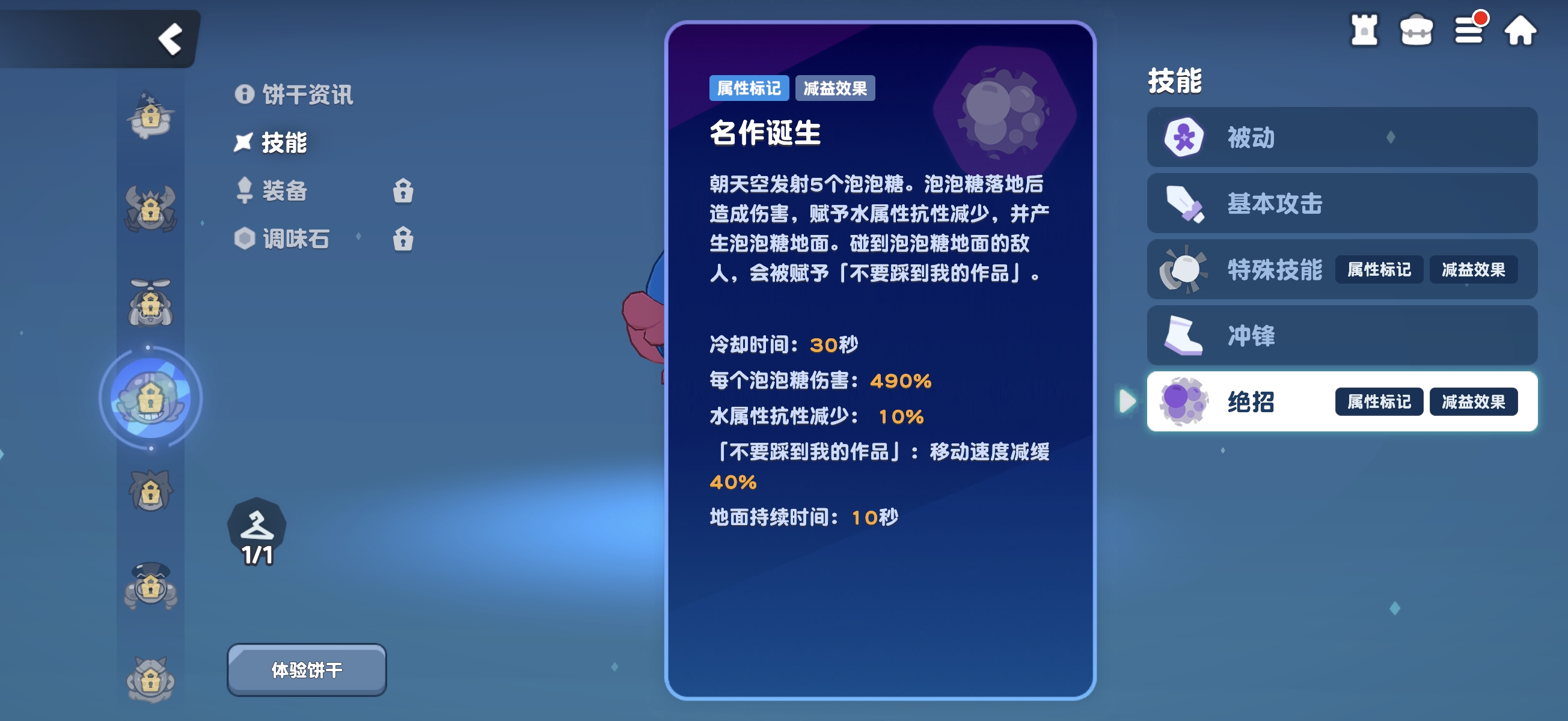 泡泡糖饼干是《饼干人联盟》中一位兼具控制与辅助能力的角色,其设计灵感源自经典零食——外层为酥脆的泡泡糖外壳,内里包裹香甜柔滑的馅料,整体造型活泼可爱。角色手持巨型糖果棒,视觉辨识度高,在战斗中主要承担团队增益与敌方限制职责。尽管稀有度为普通级别,但凭借稳定的水属性协同机制,在中低阶阵容中具备不可替代的战术价值。