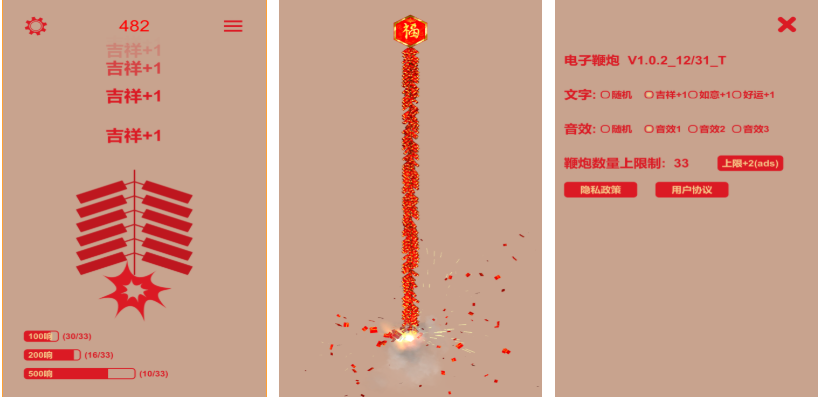 电子鞭炮这款模拟放鞭炮的游戏作品毫无丝毫危险,真实环绕的鞭炮音效和烟雾效果辨识度极高,一长串的鞭炮燃放殆尽的过程也很热闹,你甚至能够自定义鞭炮的数量以及音量大小,想看烟花又不敢亲自燃放的小伙伴可以试试,超级舒适且喜庆的气氛展现会给人过年的感觉,这款电子鞭炮模拟类手游作品可玩性非常高。
