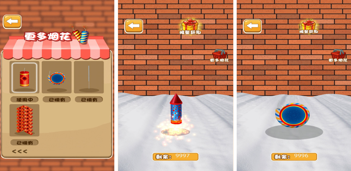 甩鞭炮是款用第一视角燃放鞭炮的精品模拟作品,你的任务就是点触引线快速燃放各种烟花爆竹,礼花、炮仗等经典鞭炮应有尽有,大红色的背景衬托出十分喜庆的气氛,操作方面无难度但带来的惊喜体验别具一格,不受限制的燃放烟花游戏理念令人百玩不腻,你也试着在虚拟世界点燃各种烟花鞭炮吧。