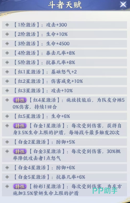“太虚拳”不仅提供高额单体伤害,还附带基于自身当前生命值70%的护盾效果,可持续两回合。该机制使其在前排站位中具备极强的生存韧性,是整套技能循环的战术支点。天赋成长方面,五阶阶段主要强化生命上限、暴击率与抗爆率;升至红星阶段后,额外获得怒气获取效率提升与界面特效优化。最关键的特性激活节点为红四星:释放技能后,可为全体友方分担50%所受伤害,持续一回合——此效果对保护萧炎、萧薰儿等高输出脆皮角色具有不可替代的战略意义。白金一星天赋则赋予每次受击后生成相当于自身3.5%最大生命值护盾的能力,单场战斗最多触发20次,累计护盾量可观。