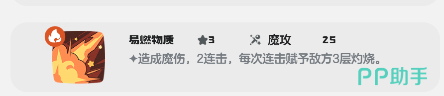 造成25点的魔法伤害 每一次技能都会对敌人进行2连击,每次连击都会给敌人附加上3层灼烧。