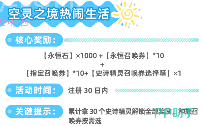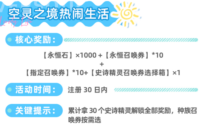 “空灵之境热闹生活”活动有效期为注册后30天内,目标为累计收集30个史诗精灵。达成后可解锁包含1000颗永恒石、10张永恒召唤券、10张指定召唤券及1个史诗精灵召唤券选择箱的全套奖励。该目标在正常推进主线与常规卡池抽取节奏下即可自然达成,整体奖励结构均衡,兼顾资源储备与角色获取效率。