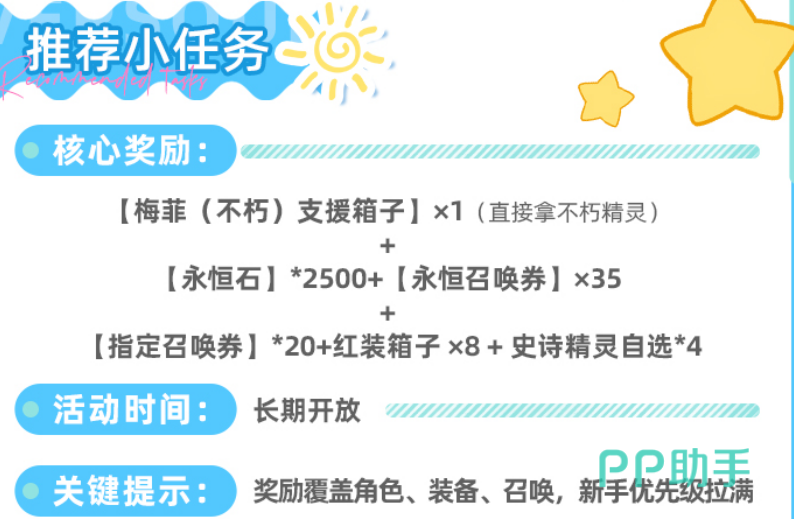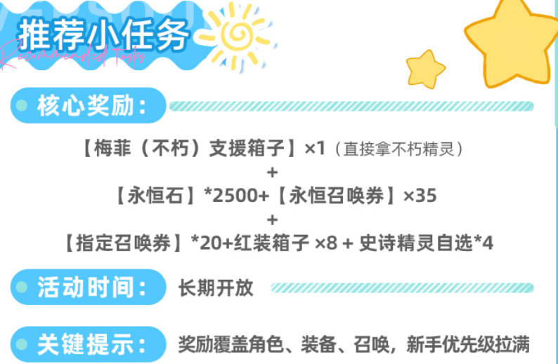 “推荐小任务”为长期开放的成长引导系统,全程无难度门槛。全部25项任务涵盖新手教学全流程,如通关指定副本、提升角色等级、解锁功能模块等,基本随主线推进自然完成。完整达成后可获得2500颗永恒石、35张永恒召唤券、20张指定召唤券、8个红装宝箱及4个史诗精灵自选权。该任务入口位于主界面右侧,进度实时可见,建议优先完成以快速激活资源循环。