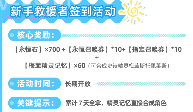 签到类活动共设两项:其一是“新手救援者签到”,连续签满7天即可领取700颗永恒石、10张永恒召唤券与10张指定召唤券;其二是“上线纪念签到”,持续14天,总计可获2400颗永恒石与20张指定召唤券。两项叠加共得3100颗永恒石,折合约10张永恒召唤券价值,属于稳定可控的周期性收益来源。