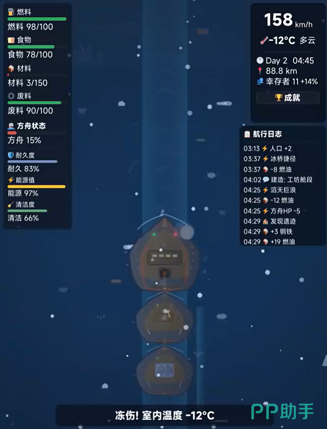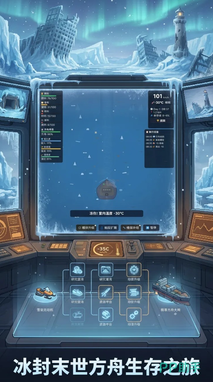 本作构建于全球冰封的末日世界观中,玩家将担任一艘移动方舟的最高指挥官。核心玩法围绕多重生存指标展开:需实时调控食物储备、燃料存量、基础建材余量;同步维护方舟本体的结构耐久度、能源输出效率与内部清洁水平;并应对持续低温引发的冻伤风险,保障载具系统稳定运行。