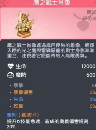 鹰之战士金像:兼顾生存与输出的团战利器。提供12000点高额生命值与600点魔法防御,在前中期团战中大幅延长站桩输出时间;10点暴击、5%法术攻击、5%暴击伤害构成三维输出补强;3%生命值加成进一步提升残血反打容错率,确保低血量状态下仍能依靠技能完成收割或反杀。该装备在中后期大规模混战中价值尤为突出,是构建稳健输出环境的关键一环。