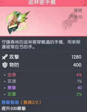巡林客手套:表面偏重物理向,实则与洛基技能机制高度契合。1280点法术攻击进一步夯实输出基础;400点物理防御弥补法师本体脆性;6%生命值加成提升血线厚度,对抗突进型刺客更具反制空间;1%攻击速度虽数值不高,但可优化普攻衔接技能的节奏感,使连招更紧凑。关键在于两件套效果:额外提供200点暴击属性及暴击率加成,显著增强高频技能的收益转化效率。