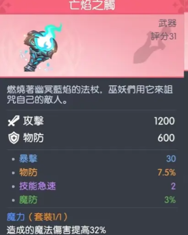 亡焰之触:法师阶段毕业级核心装。提供1200点固定法术攻击,同步附加3%魔法防御与7.5%物理防御,有效平衡双抗短板。30点暴击属性直接强化灼烧与诅咒类效果的触发频率;套装附带32%魔法伤害加成,等效于全技能享受恒定增伤,是提升整体DPS的基石选择。