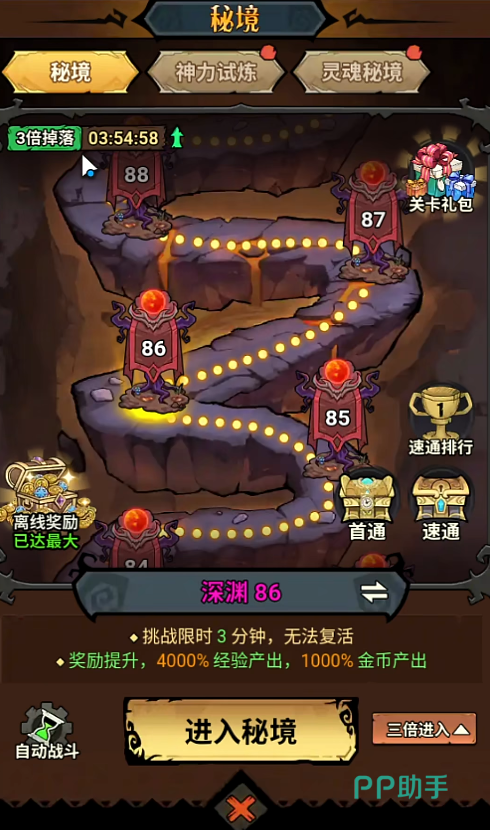 秘境系统是零氪玩家的核心资源来源之一。除固定奖励外,秘境同样享有三倍掉落加成时段;同时,挑战次数与离线收益直接挂钩——每日主动完成更多层数,不仅能即时获得大量装备碎片与经验药水,还能持续积累离线挂机产出,形成良性循环。建议每日优先清空秘境次数,避免资源浪费。