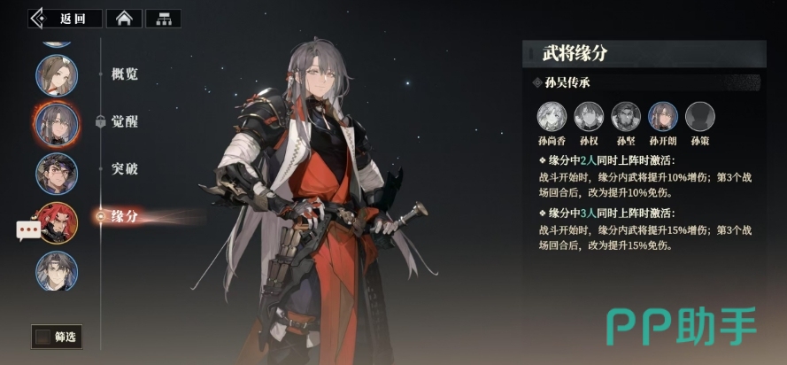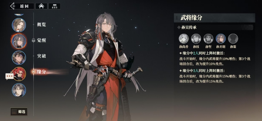 这一羁绊效果,将孙尚香、孙权、孙策、孙坚以及孙开朗这五位武将都联系在了一起,当其中任意两位同时上阵时,缘分内的所有武将都将获得10%的增伤效果,而当战斗进入第三个回合,这种增伤效果又会转变为10%的免伤效果,为队伍在战斗后期提供了更强的防御能力,倘若这五位武将中的任意三位同时上阵,那战斗开始时的增伤效果将提升至15%,而同样地,当战斗进入第三个回合,这种增伤效果也将转变为免伤效果,但这次的免伤比例提升至了15%。