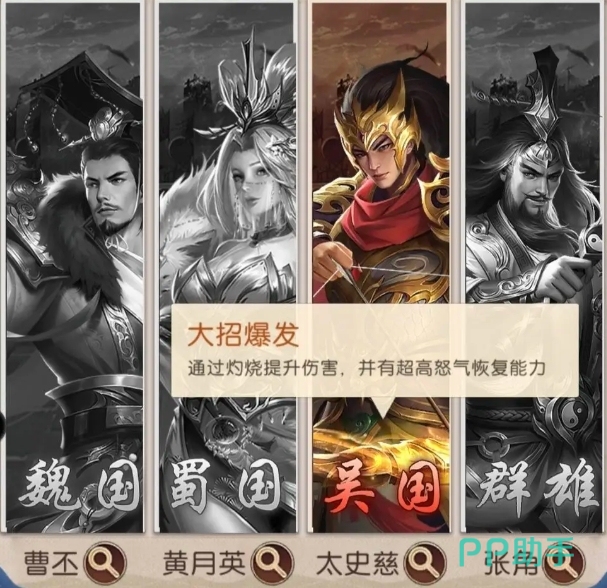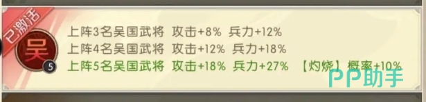 吴国的提高灼烧概率是按照人数来定的,人数越多加成的数值越高,最高的时候是可以提升到攻击提升18%,兵力提升27%以及灼烧概率提升10%的效果,太史慈其实在队伍当中负责的就是点火,也属于是核心角色,所以是必不可少的角色之一,而周泰的必杀列阵事很适合放在前牌的,有效果可以恢复兵力,防御也很适合放在这个队伍,而且周泰的技能还可以对敌人造成一定的伤害,并有几率使敌人陷入虚弱状态。