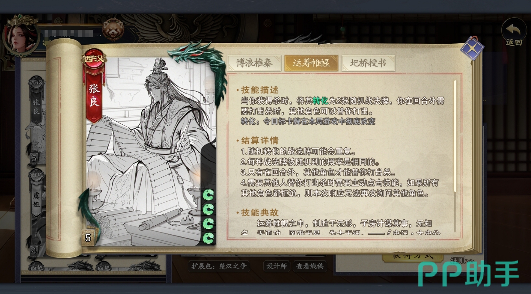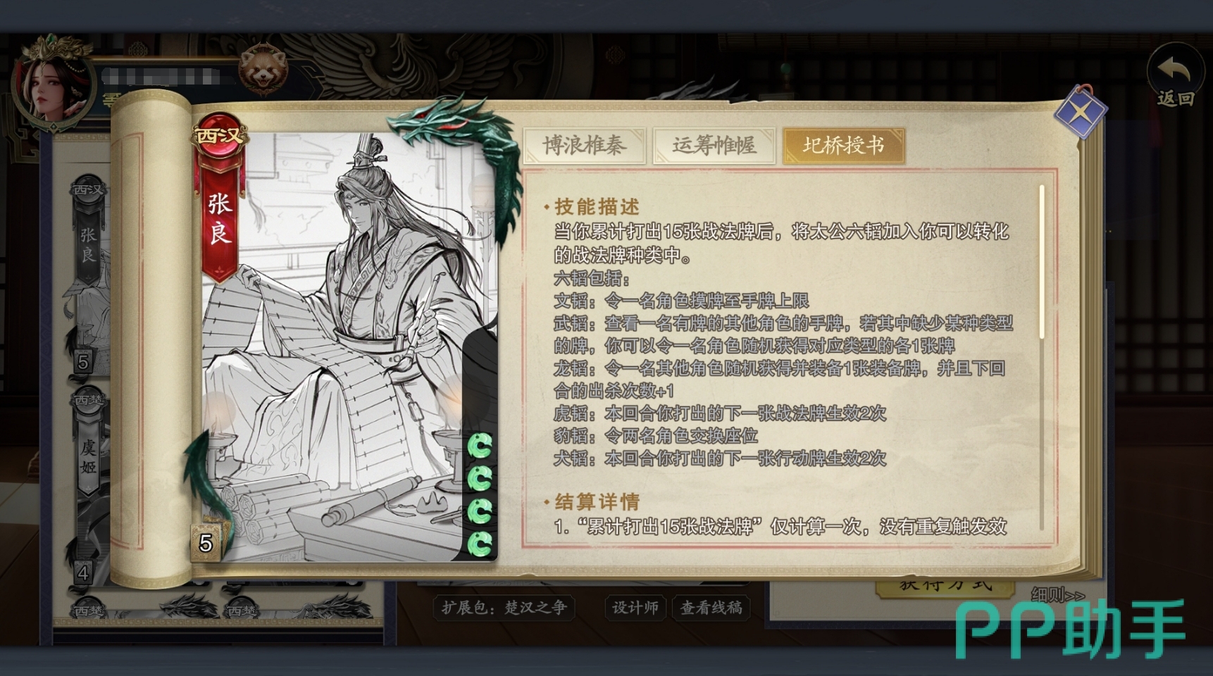 张良的二技能运筹帷幄会直接将自己获得的杀转化为战法牌,所以张良手上是不会有杀的,他只能通过战法牌来打伤害。但只要他打出了15张战法牌,就能解锁三技能,将太公六韬列为可被转化的战法牌。因此,实战里张良最重要的目标就是快速打出足够数量的战法牌,所以与一些能给自己牌的武将搭配,会令张良的上限变得非常高。