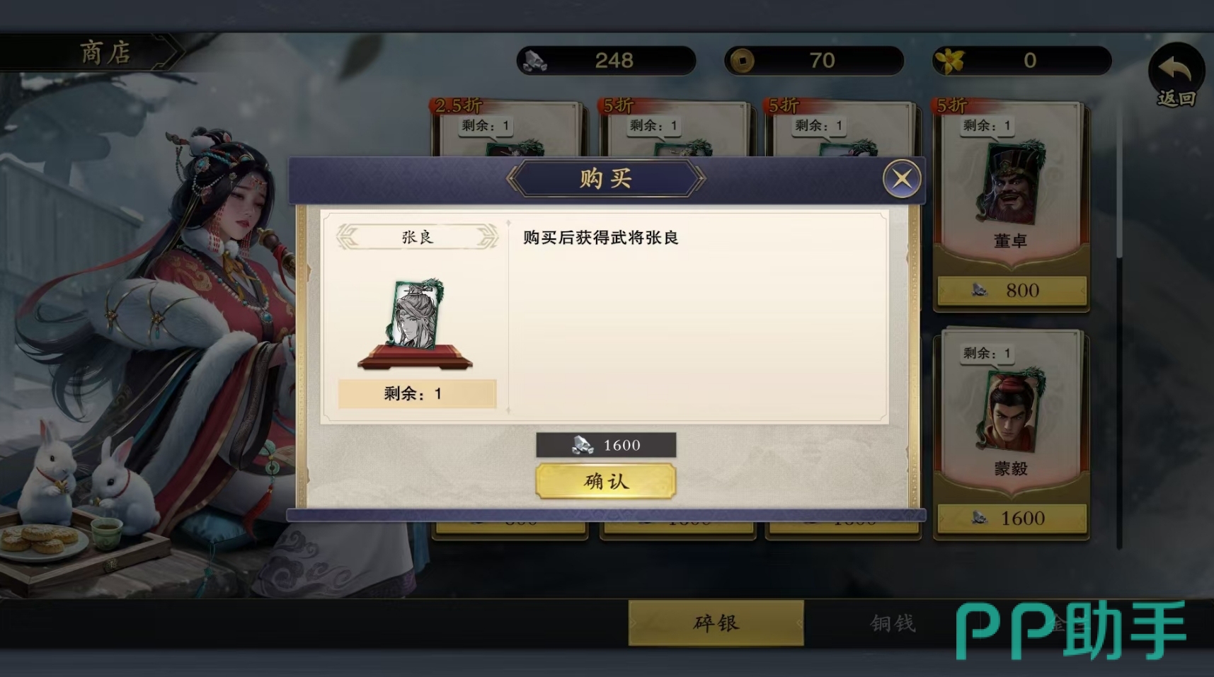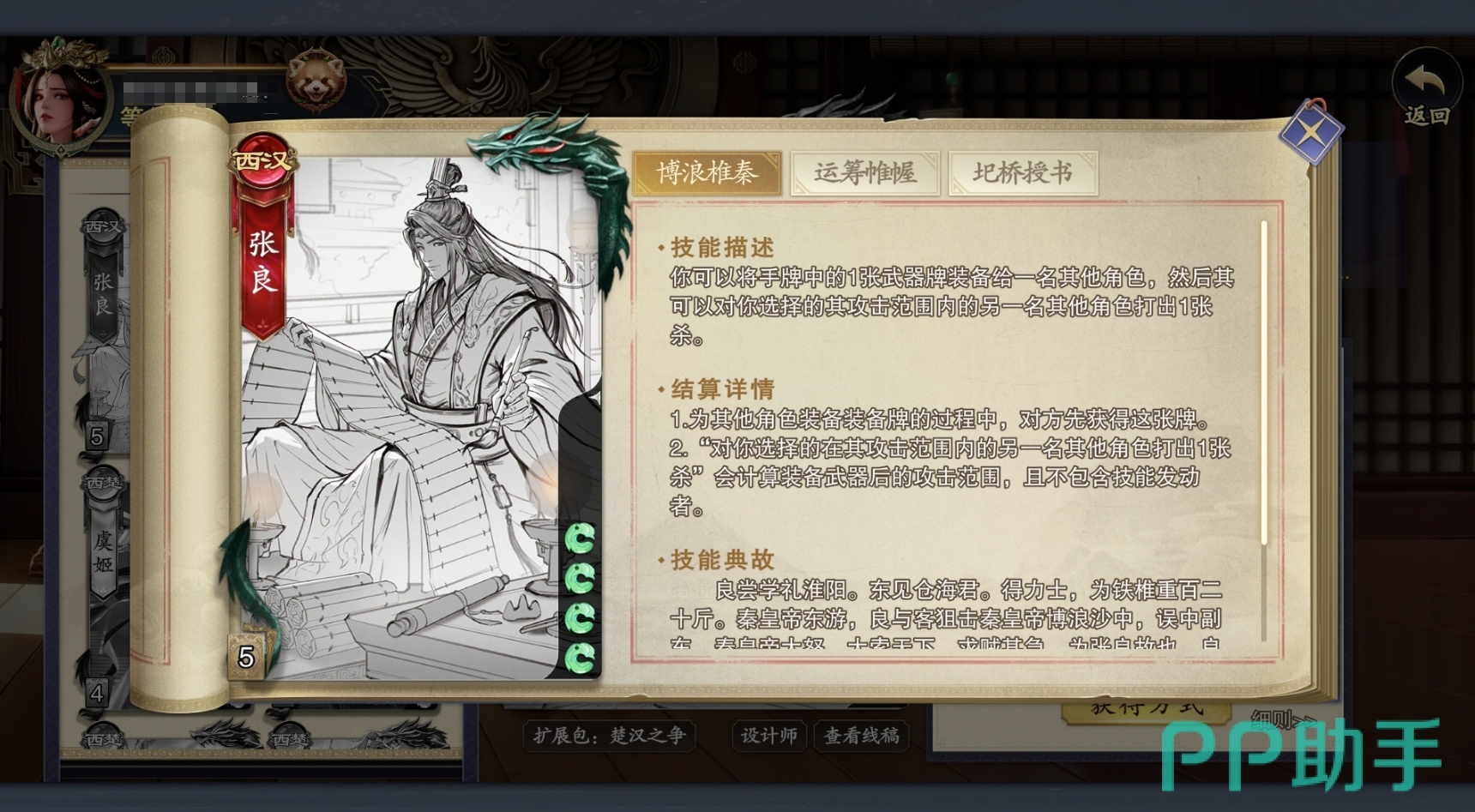 目前张良可以在碎银商店里用碎银来进行购买,买完后就能在各模式中使用他。在设计上,张良是一个四血三技能武将,其中一技能博浪椎秦可以直接为别的角色装上武器,并令目标选择一名自己攻击范围内的角色出一张杀,配合一些对装备有需求的武将,或是出杀能触发机制的武将会非常好用。