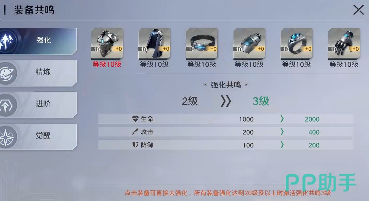 值得注意的是,本作独创【装备共鸣】机制,是突破战力瓶颈的关键设计。共鸣共分四大方向:强化共鸣、精炼共鸣、进阶共鸣、觉醒共鸣。四者彼此独立,各自拥有独立等级。当某类操作(如强化)在全部六件装备上均达成同一等级时,对应共鸣等级即自动提升,激活额外百分比属性加成。该加成不占用装备栏位,且数值可观,属于无门槛叠加型战力增幅。