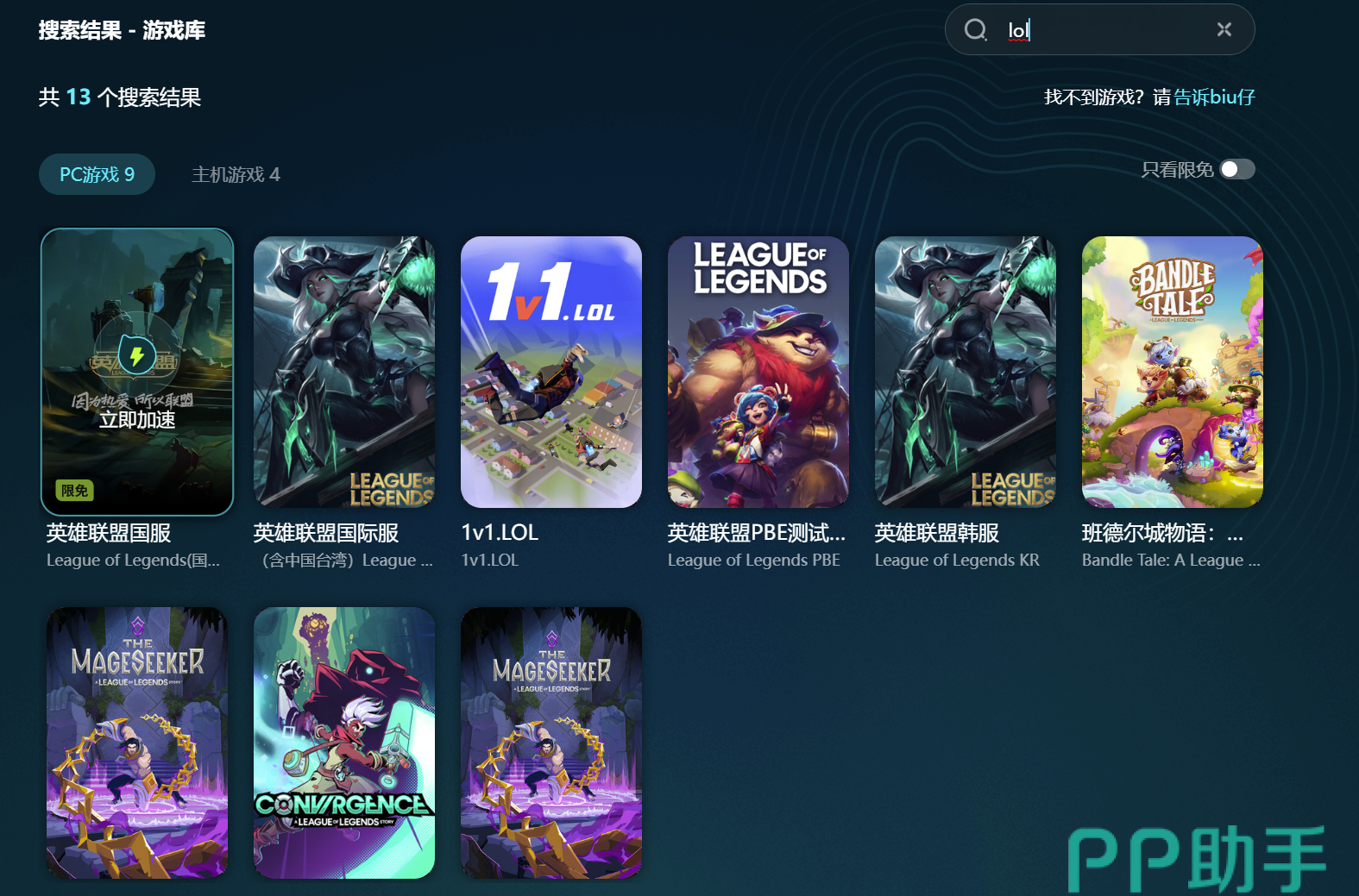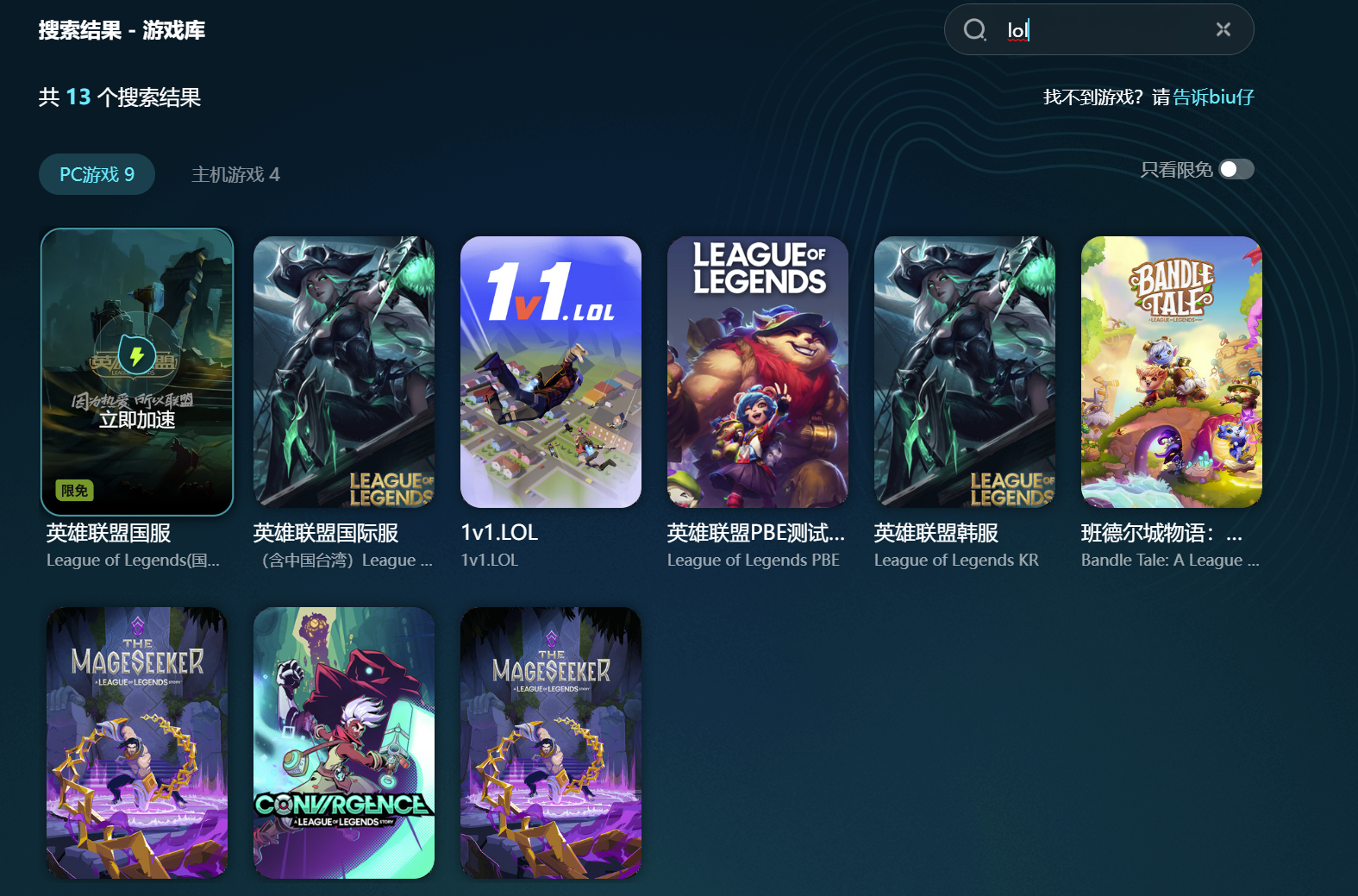 想免费提升游戏下载更新速度,还能在游戏过程中享受流畅加速体验?那么这款加速器绝对是你的不二之选。目前该平台已经开放了英雄联盟的限免加速服务,而且除了国服外,它还涵盖了多款lol系列游戏。要是你还有其他想玩的游戏,直接在加速软件里搜一搜,它那强大的资源库绝对能给你带来惊喜。支持全球上万款游戏的加速,无论你想玩什么,它都能轻松应对。