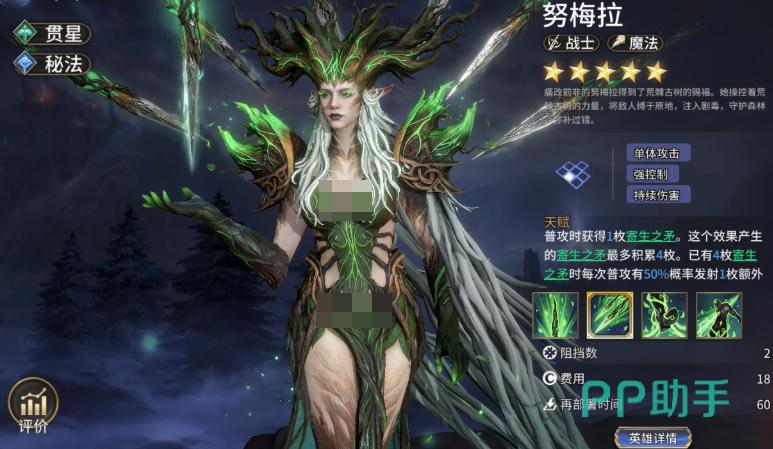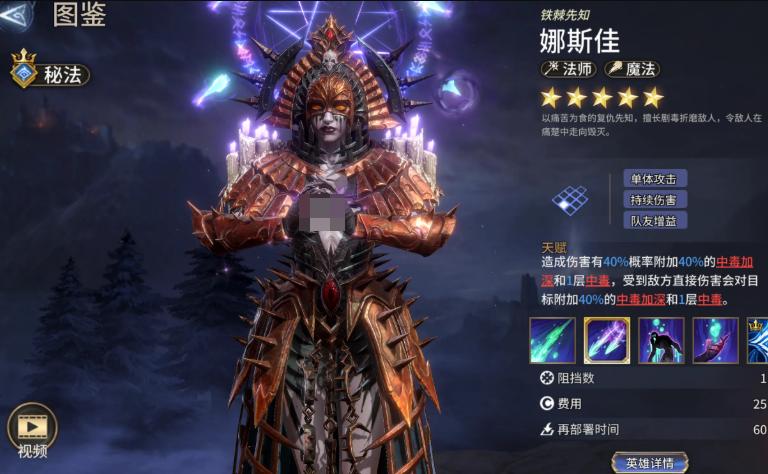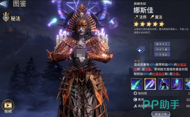 娜斯佳作为秘法会阵营领袖,不仅加快全队大招释放频率,还能依据目标所受减益数量额外提升伤害,大幅强化体系整体输出效率。其一觉技能可为周围两格内所有友方单位提供中毒免疫效果,这一特性在泰坦废墟第三阶段面对高频中毒环境时具有不可替代的战略价值。
