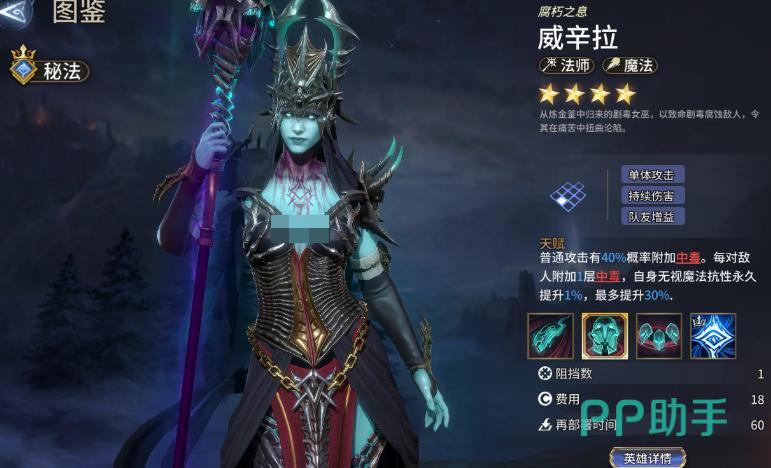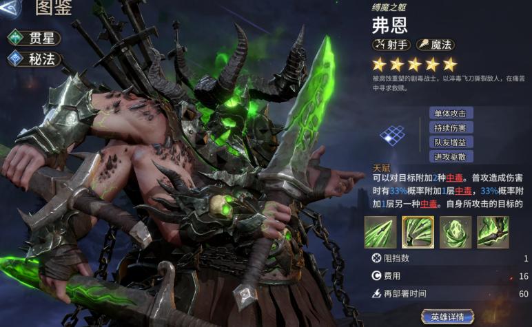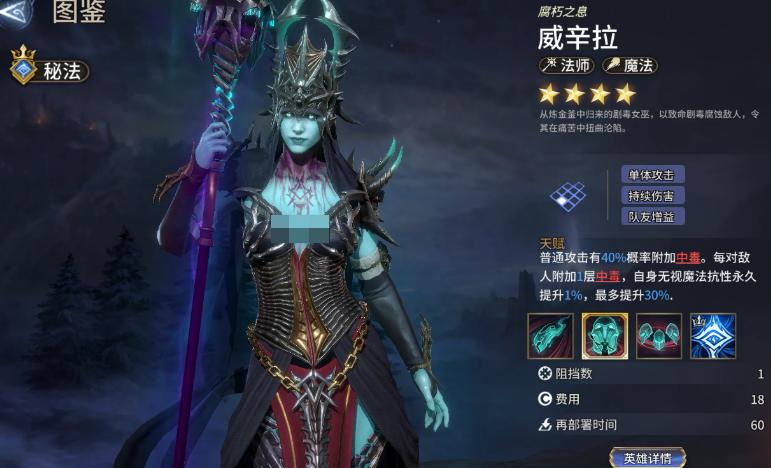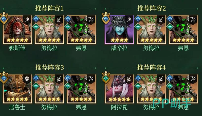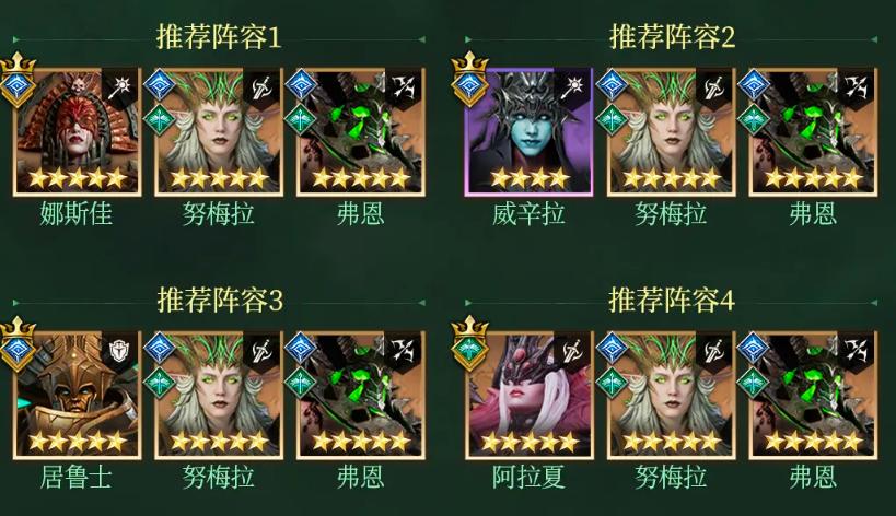 整套中毒流派遵循清晰的三阶循环:先由弗恩、威辛拉等角色快速叠加中毒层数;再由娜斯佳强化中毒效果并降低目标抗性;最终由努梅拉集中引爆,完成高额爆发输出。该逻辑闭环确保了极高的单体处理效率。常规推荐组合为娜斯佳+弗恩+努梅拉,三人形成稳定正向反馈。若暂未获取娜斯佳,可选用四星领主威辛拉作为过渡方案——虽无直接增伤技能,但可降低技能消耗并持续挂毒,保障努梅拉毒爆伤害基础。