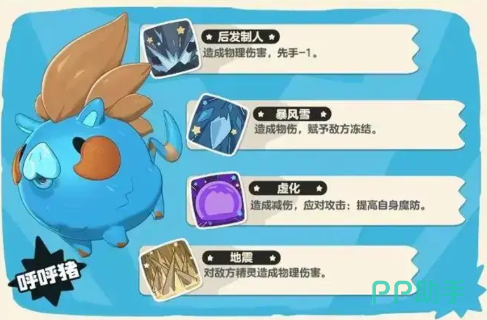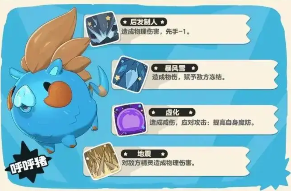 需特别注意其特性触发条件:仅当队伍中携带且实际装备两个冰系技能(如暴风雪、冰霜之风、冰强等)时,该特性方可生效。因此在阵容配置阶段,应避免随意替换核心冰系技能,确保特性稳定激活。合理规划技能轮换节奏与冷却管理,是发挥呼呼猪持续作战能力的关键前提。