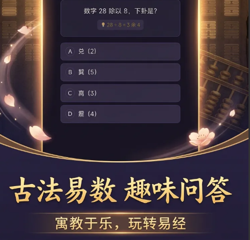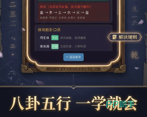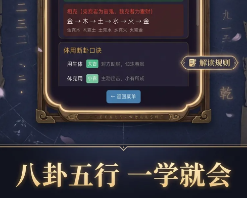 本作以传统国学体系中的“梅花易数”为知识内核,构建出兼具文化厚度与操作亲和力的手游体验。玩家将在水墨写意风格的东方场景中,逐步接触乾兑离震巽坎艮坤八宫逻辑、体用生克断卦原理、时间起卦与数字起卦方法论等内容。游戏模块涵盖易理入门教学、卦象推演训练、情境化占卜解谜、自由交互式卜算等多元环节。