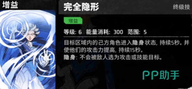隐形女的终极技能“完全隐形”是她战术地位的核心体现。施放后,技能范围内的所有队友将进入持续5秒的隐身状态,在此期间不会受到任何敌方技能命中,且无法被选为目标。同时,处于该状态下的角色还将获得攻击力提升,增益效果可持续长达15秒。这项技能在应对敌方集火或强力AOE技能时具有极高的生存保障价值,能够在危急时刻扭转战局,并为后续反攻创造有利条件。