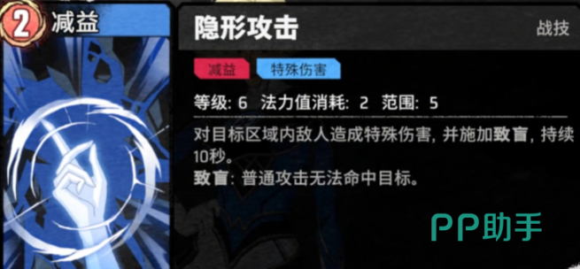 隐形女的一技能名为“隐形攻击”,是一项集伤害与控制于一体的多功能技能。释放时可选定敌方某一区域目标,造成特殊伤害的同时附加持续10秒的致盲效果。被致盲的单位将无法进行普通攻击输出,这一特性使其对依赖普攻进行持续输出的敌人形成有效压制。尤其在战斗初期使用,能够打乱敌方节奏,为己方争取主动权,是副本推进和PVP对抗中极为实用的先手干扰手段。