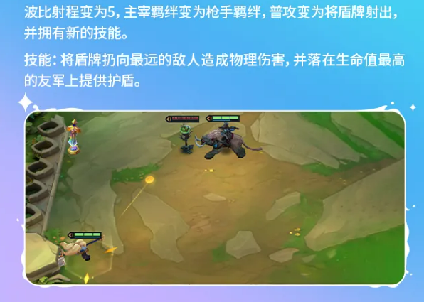 “炮形态波比”重构其技能模型:普攻射程提升至5格,主宰羁绊变更为枪手羁绊,普通攻击改为投掷盾牌,技能则锁定生命值最高的敌人投掷造成物理伤害,并在生命值最高的友军位置生成护盾。该改动使波比兼具远程压制与团队保护能力,适配高血量前排搭配体系。