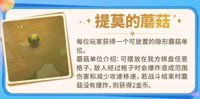 “提莫的蘑菇”提供一枚可部署的隐形单位,置于己方棋盘任意空格。当敌方单位经过该格时触发爆炸,造成范围伤害并施加攻速与移速降低效果;若整场战斗未被触发,则返还2金币。部署策略需预判对手常用走位路径,尤其关注前排切入路线与后排输出落点,盲目放置将导致资源浪费。