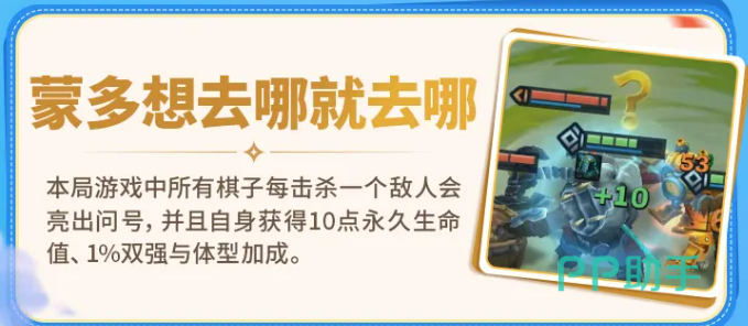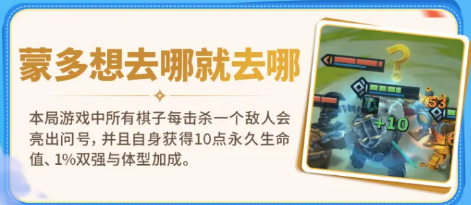 “蒙多的效果”为全局常驻机制:每名棋子每次击杀敌方单位后,永久获得10点生命值、1%双抗加成及体型增长,并同步显示问号标记。该效果具备显著滚雪球特性,前期连胜可大幅加速后期战力膨胀,建议在选秀与野怪阶段优先保障核心输出生存,以维持击杀链连续性。