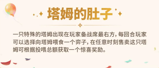 “塔姆的肚子”作为备战席最右侧独立单位,支持每回合喂入一名弈子,后续可随时售出并依据所喂弈子总费用获得随机奖励。操作要点在于控制投入成本:推荐使用1费或2费非核心卡进行喂养,严禁投入高费主C或关键羁绊成员,确保资源转化效率最大化。