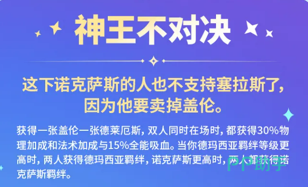 强化符文中,“神王不对决”要求盖伦与德莱厄斯同时登场,即可激活30%物理伤害加成、30%法术强度加成及15%全能吸血效果;此外,将根据场上德玛西亚或诺克萨斯羁绊中等级更高的一方,为二者额外赋予对应羁绊效果。该符文强调双体系协同构建,需围绕任一势力羁绊深度扩展,而非简单堆叠双英雄。