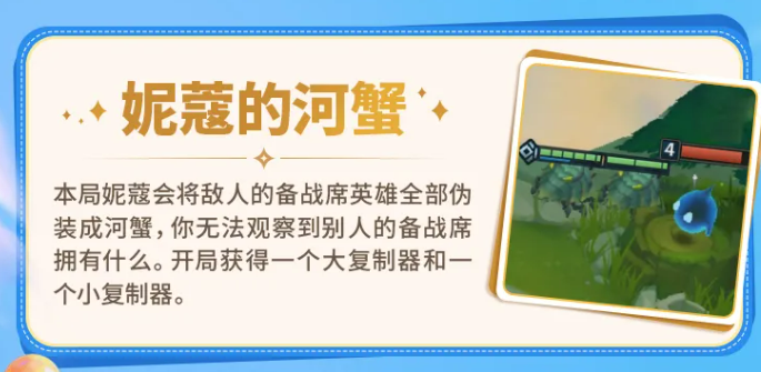 “妮寇的河蟹”干扰对手信息获取——所有敌方备战席英雄图标统一替换为河蟹形象,无法识别其阵容构成与升星进度。作为平衡,本局开局即赠送一个大复制器与一个小复制器。复制器资源极为珍贵,建议优先复刻当前阶段可立即成型的关键低费卡或羁绊核心,避免无谓消耗。