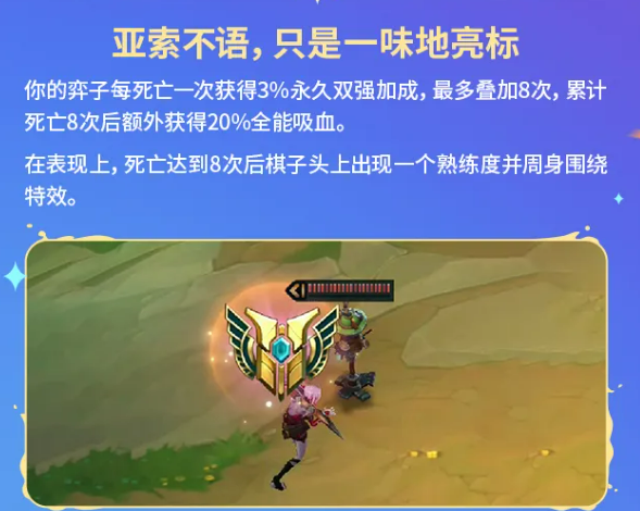 “托儿索”属于死亡叠加型强化,单次阵亡可获得3%永久双抗加成,最多叠加8层;叠满后额外解锁20%全能吸血,并在棋子头顶显示专属特效。该符文鼓励中期主动控血换层,建议在3-2或4-1阶段通过可控牺牲完成层数积累,确保5阶段起具备爆发压制力。
