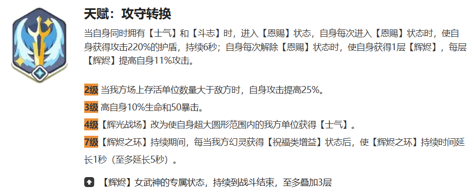 其核心机制“攻守转换”围绕士气与斗志双重状态展开:当布伦希尔德同时拥有士气和斗志时,自动激活恩赐状态,生成一个相当于自身攻击力220%的护盾,持续6秒;恩赐结束后,将获得1层辉烬,每层提升11%攻击力,最多叠加至3层,满层时总攻击加成达33%,且该效果全程持续至战斗结束。