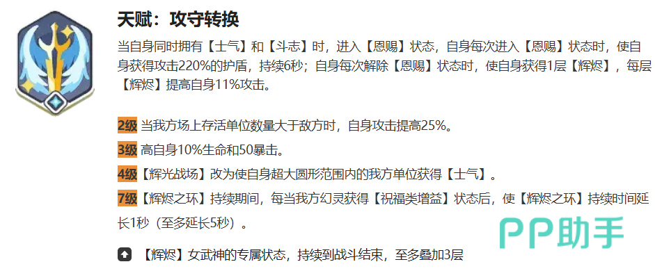 天赋系统提供多阶段强化路径:2级天赋在己方存活人数多于敌方时,直接提升布伦希尔德25%攻击力;3级天赋增加10%最大生命值与50点暴击属性;4级天赋大幅扩展绝技“辉光战场”的作用范围,由原本仅作用于自身,升级为覆盖超大范围内的全体友方单位,并为其施加士气;7级天赋优化奥义“辉烬之环”,每当有队友获得祝福类增益效果时,该技能持续时间延长1秒,最多延长5秒。