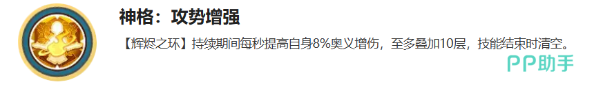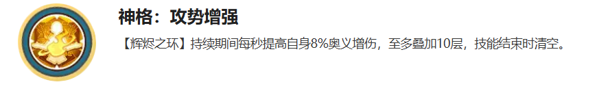 神格被动“攻势增强”专为爆发输出设计:在“辉烬之环”持续期间,每秒提升8%奥义伤害,最多叠加10层,即最高可获得80%奥义增伤。该增益在技能结束后清空,需玩家精准把握释放节奏以实现伤害最大化。