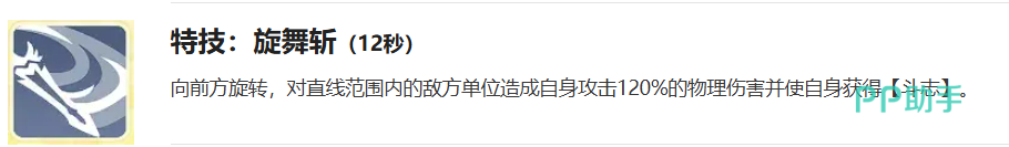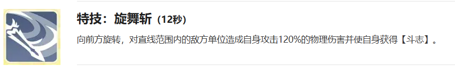 特技“旋舞斩”冷却时间12秒,向前方直线范围发动旋转攻击,造成攻击力120%的物理伤害,并为自身施加斗志效果,是稳定获取斗志状态的核心技能,配合“辉光战场”可高效达成恩赐条件。