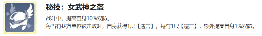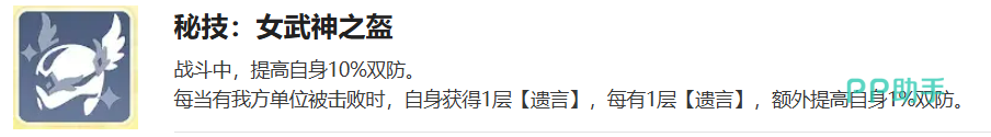 被动技能“女武神之盔”提供基础双防提升10%,并在每次有友方单位被击败时,为布伦希尔德叠加1层遗言,每层额外提升1%双防。该机制显著增强逆风战局中的生存韧性,随战况恶化而持续强化防御能力。
