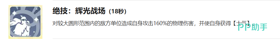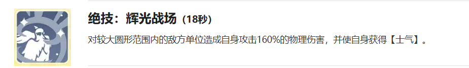 绝技“辉光战场”同样拥有18秒冷却时间,对较大圆形区域内的敌人造成攻击力160%的物理伤害,并使自身获得士气。该技能与天赋联动紧密,是快速构建“士气+斗志→恩赐”循环的关键启动手段。