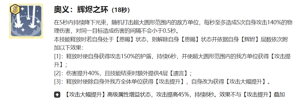 若在恩赐状态下释放“辉烬之环”,将立即解除恩赐,并依据当前辉烬层数触发差异化强化效果:1层辉烬时,获得攻击力150%的护盾(持续6秒),并为范围内所有友方单位附加攻击提升效果;2层辉烬时,奥义总伤害提升40%,技能结束时额外赋予布伦希尔德4层遗言;3层辉烬为最高阶形态,除布伦希尔德自身获得持续8秒、提升45%攻击力的强力增益外,其余所有友方单位同步获得攻击提升效果。
