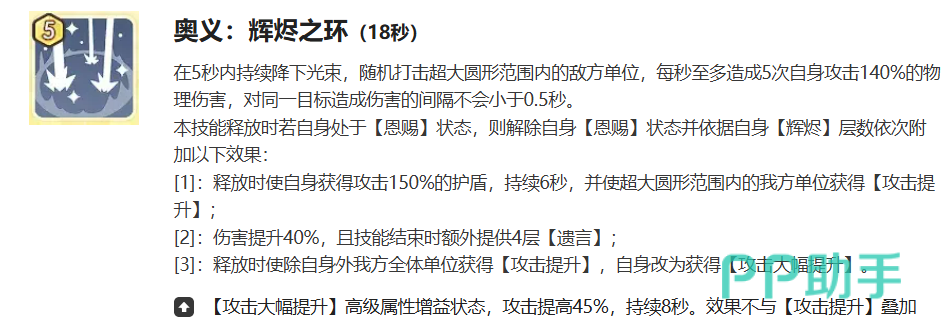 奥义“辉烬之环”冷却时间为18秒,释放后在5秒内持续降下随机光束,对超大圆形区域内的敌人造成共计最多5次/秒的打击,每次伤害为攻击力的140%,同一目标受击间隔不低于0.5秒,确保伤害分配高效合理。