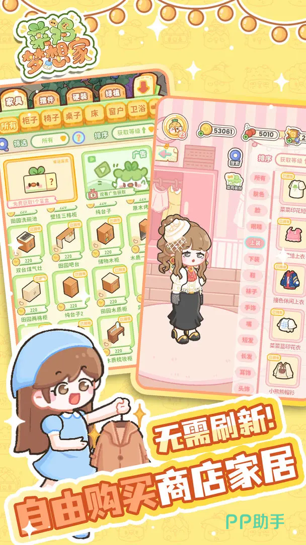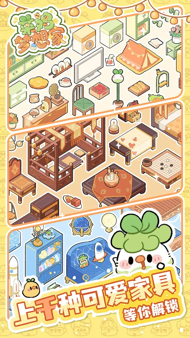 《菜鸡梦想家》是一款主打生活化模拟与高自由度房屋定制的休闲手游。玩家将扮演一位新搬入社区的居民,在充满烟火气的世界中,与性格各异、风格多样的“菜鸡”共同居住、互动成长。游戏以家具收集与空间布置为核心,打破传统格子限制,支持家具360度任意旋转、多角度摆放——不仅室内可自由布局,沙发之上也能叠加装饰,户外空地同样支持家具陈设,甚至可移除房屋结构,直接在开放基地上构建理想居所。