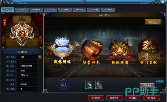 进入到宗门仓库,可以把自己所想要的物品都储存于这里,而其他的那些成员也可以自由的使用仓库里面的设备,可以迅速的提升整个团队成员的整体水平。战意附体可以给每一个宗门内的宗主又或者是左右护法带来属性加成。