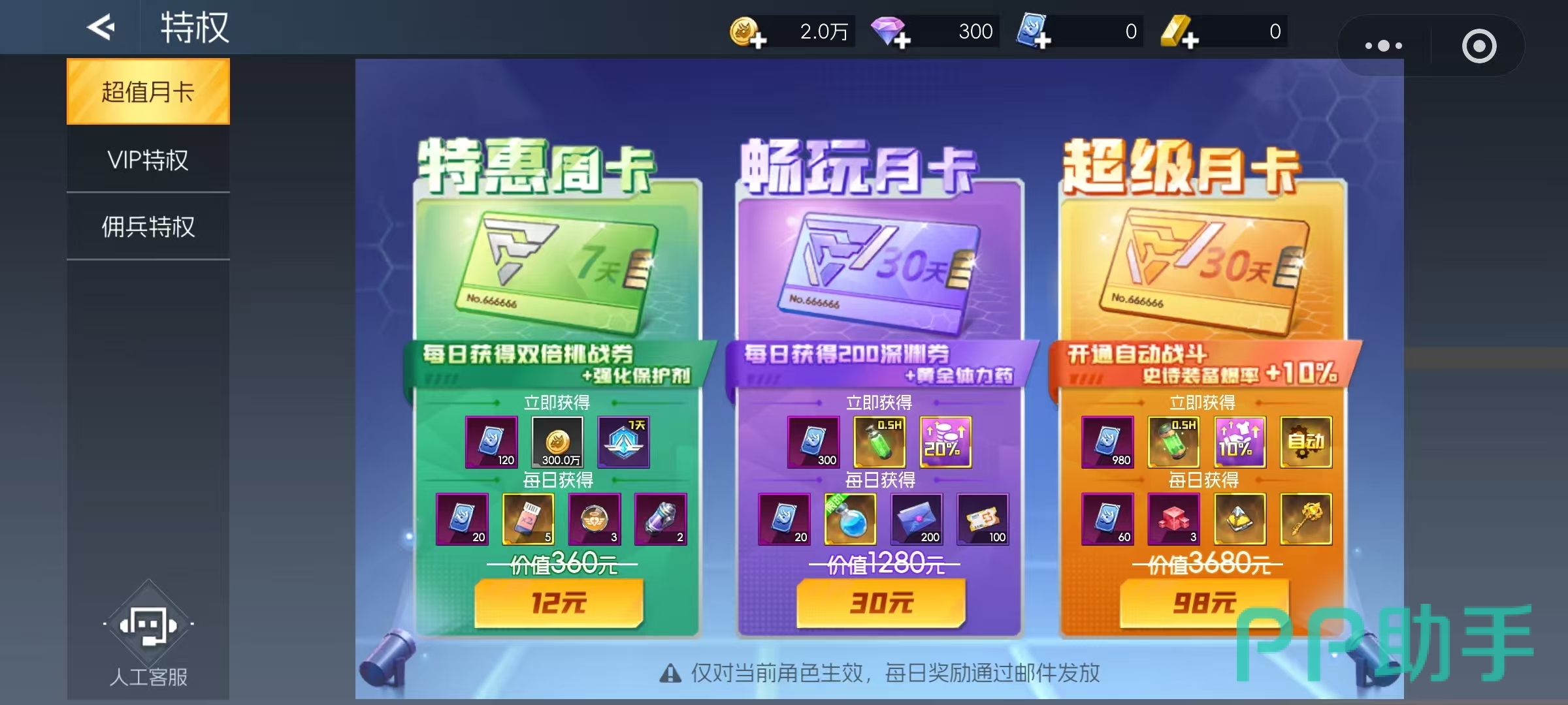进入游戏后,点击界面左上角即可进入特权中心。目前特权主要分为三类:超值月卡、vip特权以及佣兵特权。首先来看超值月卡体系,它细分为特惠周卡、畅玩月卡和超级月卡三种类型。激活特惠周卡后,每日可领取双倍挑战券与强化保护剂;选择畅玩月卡,则每天能获得200深渊卷和黄金体力药;而解锁超级月卡后,不仅能启用自动战斗功能,还能提升史诗装备10%的掉落概率。