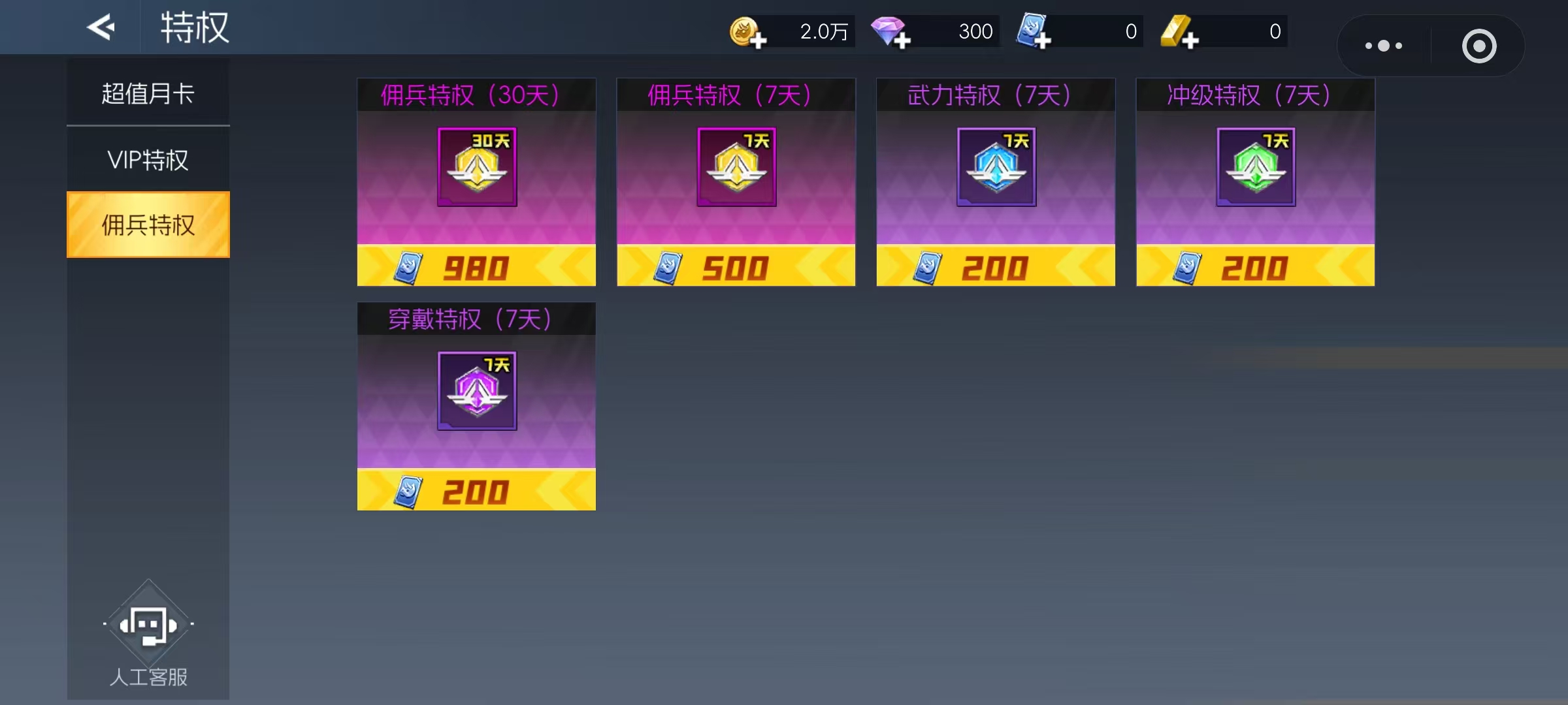 最后是佣兵特权模块,涵盖佣兵特权、武力特权、冲级特权和穿戴特权四项内容。这些特权可通过点券直接解锁,而点券可通过购买月卡等活动逐步积累。其中,佣兵特权性价比最高,一旦激活即可联动开启其余特权项目。武力特权允许技能等级进一步提升;冲级特权则提升主线关卡的经验获取量;穿戴特权可让角色提前5级装备高阶装备,加快成型速度。
