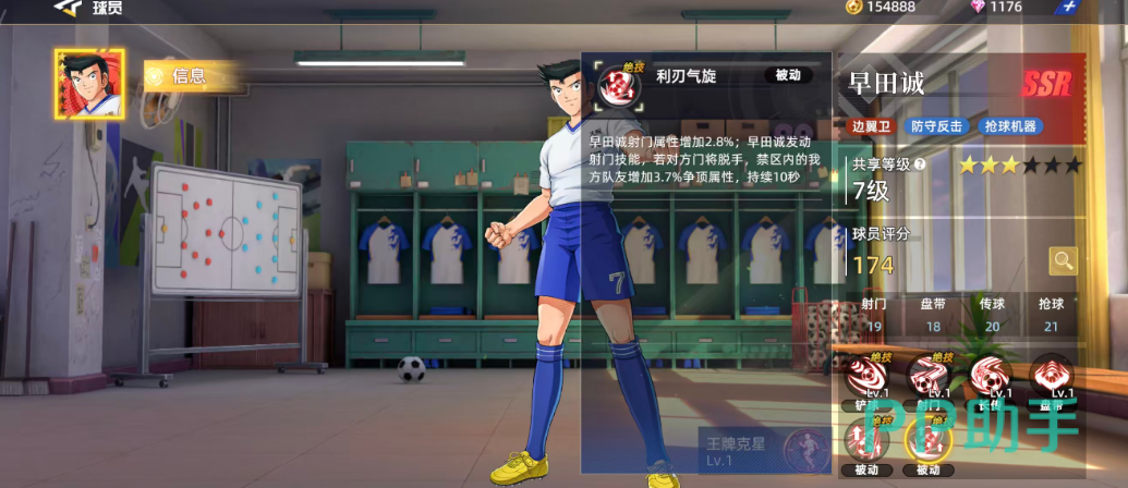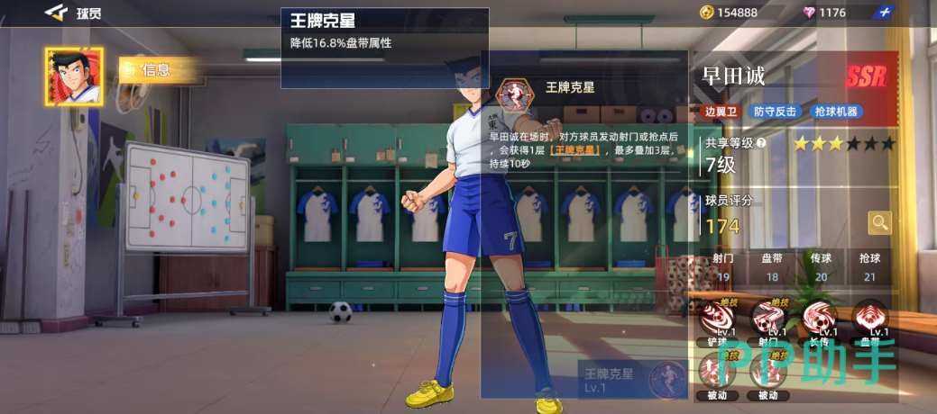 最后,“王牌克星”作为核心机制之一,属于战略性强的被动大招。只要早田诚在场上,每当对手球员执行射门或抢点动作时,他便会叠加一层【王牌克星】状态,最多可叠加三层,持续时间10秒。该状态不仅能配合“利刃打磨”增强属性,还能使目标球员的盘带能力下降16.8%,极大削弱对方关键球员的持球突破能力,从而为己方创造更多反击机会。