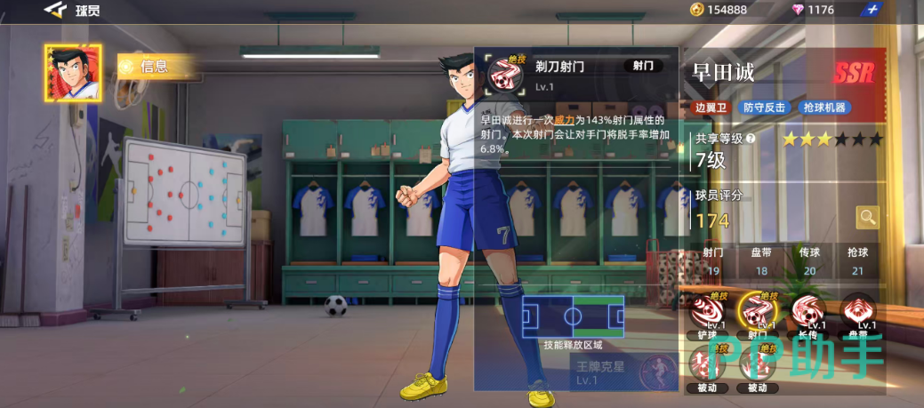 “剃刀射门”是一项高爆发的进攻技能,释放时将进行一次143%威力的射门攻击,并使对方门将出现脱手的概率提升6.8%。另一项主动技“利刃冲刺”则专注于突破,使用后可完成一次120.2%威力的盘带动作,增强推进能力。而被动技“利刃打磨”会在早田诚成功执行铲球后触发,为其自身增加2.8%的基础属性。此外,当他面对处于【王牌克星】状态的目标时,铲球威力还可额外获得4%的加成,进一步强化防守压制效果。