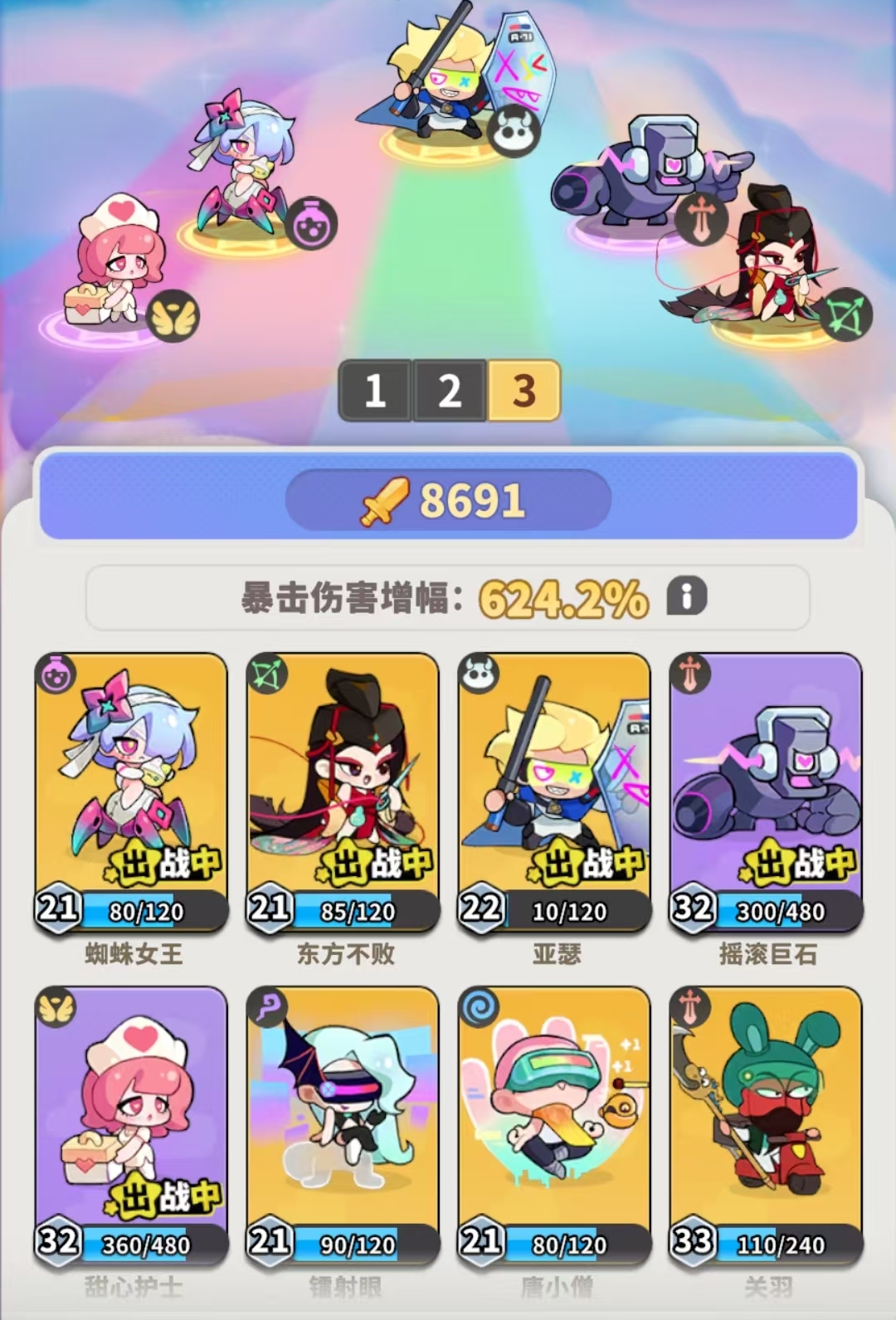 本套侧重中后期爆发构建。前期依赖东方不败快速清理杂兵、积累资源并保障生存;进入中段后逐步转向蜘蛛女王,通过叠加类强化提升其本体及召唤小蜘蛛的综合战力,最终形成多线输出矩阵。该路线对词条选择有明确阶段性倾向,操作门槛低但收益递增明显。辅助位推荐亚瑟稳固前排,摇滚巨石增强物理抗压与反伤能力,甜心护士维持续航,整体成型曲线平滑,适合资源有限的玩家。