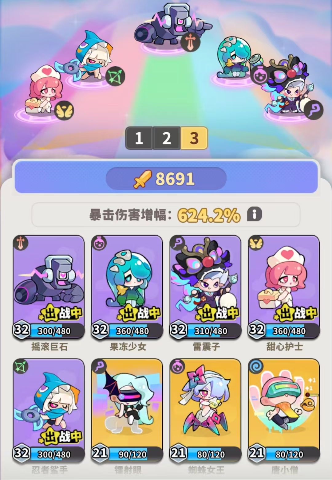 由摇滚巨石、果冻少女、雷震子、甜心护士、忍者鲨手组成的纯紫色品质阵容,无需依赖稀有传说角色即可达成稳定通关能力。其中雷震子与忍者鲨手担任主力输出,甜心护士负责治疗支援,摇滚巨石作为主坦吸收伤害,果冻少女兼具伤害补充与毒系机制触发功能——若关卡环境利于中毒持续伤害(如高闪避、低防御敌人),其亦可临时转为副C使用。该阵容碎片获取便捷、升级成本低,满星紫卡在10–20关的实际表现接近未满星传说角色,实用性突出。