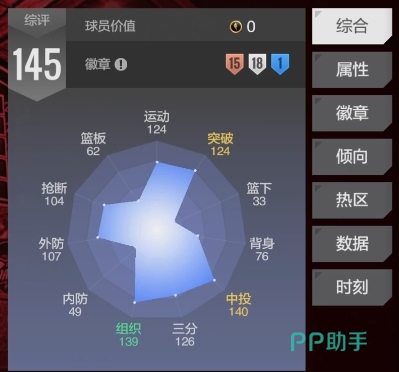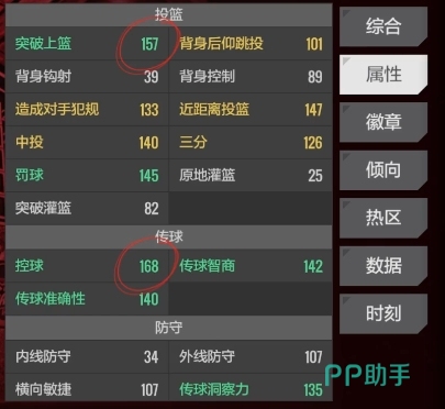 欧文之所以在游戏中的使用率极高,很大程度上得益于游戏方在初期的巧妙设定,游戏一开始就会免费赠送这个传奇球员给所有玩家,这也就意味着基本上每一位玩家都有机会拥有欧文,而且欧文自身的属性数值设定相当出色,从球场位置和数值身高188、臂展193设定来看,欧文主要擅长控球分卫这一位置,在进攻方面他的数值表现也不错,无论是突破能力还是进攻数值,都处于相当高的水平。
