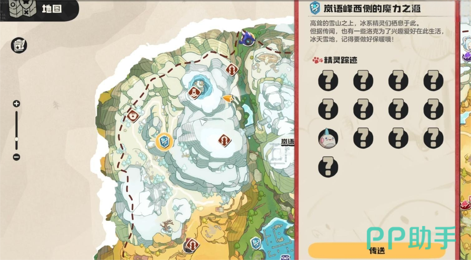 雪境的主要宝箱集中于地图西北部的雪山地带,具体位于岚语峰西侧。该区域可通过主线任务解锁的传送点快速抵达。建议携带具备滑翔能力的宠物以便灵活移动。此地常出没冰系精灵,因此搭配火系精灵如音速犬或火花能有效提升清怪效率,减少战斗损耗,保障探索进度。